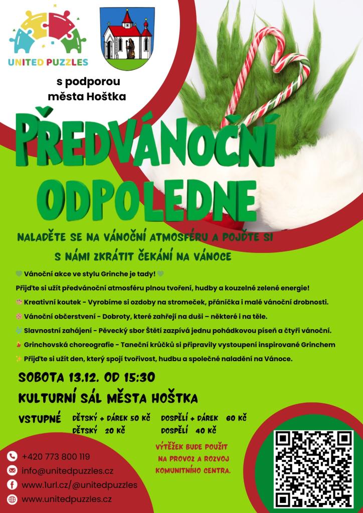Přijďte si užít jedinečnou vánoční akci, která nabídne kreativní koutek, kde si vyrobíte ozdoby na stromeček a přáníčka. Těšit se můžete také na vánoční občerstvení, které zahřeje na duši. Slavnostní zahájení obstarají členové pěveckého sboru Štětí, kteří zazpívají pohádkovou píseň a čtyři vánoční skladby. Kromě toho je připravena grinchovská choreografie, která přinese zábavné taneční vystoupení. Akce slibuje spojení tvořivosti, hudby a vánoční atmosféry, které si nesmíte nechat ujít.